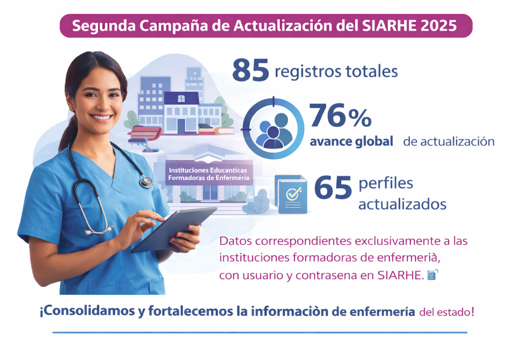 La Segunda Campaña de Actualización del SIARHE 2025 permitió consolidar los registros existentes y robustecer la base de datos estatal del personal de enfermería, favoreciendo la disponibilidad de información confiable y actualizada que apoye la planeación, gestión y toma de decisiones en materia de recursos humanos en salud, en coordinación con las instituciones formadoras del estado.