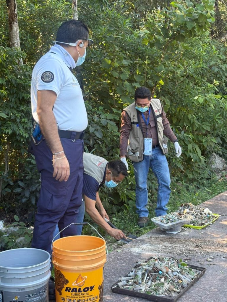 El sitio se localizó en un terreno baldío en las inmediaciones de Paseo Central y avenida Petempich, en donde se realizó el levantamiento y traslado de cerca de 4 kg de residuos punzocortantes, mismos que fueron asegurados conforme a la normatividad vigente y trasladados al Hospital General de Playa del Carmen para su confinamiento en el área de Residuos Peligrosos Biológico-Infecciosos (RPBI), bajo los protocolos correspondientes.